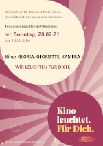 unter dem Titel „Kino leuchtet. Für dich.“ werden am Sonntag, 28.02.21 um 19:00 Uhr über 300 Kinos in ganz Deutschland durch besondere Beleuchtung erstrahlen und über die sozialen Netzwerke (gemeinsamer Hashtag #kinoliebe) sichtbar sein.